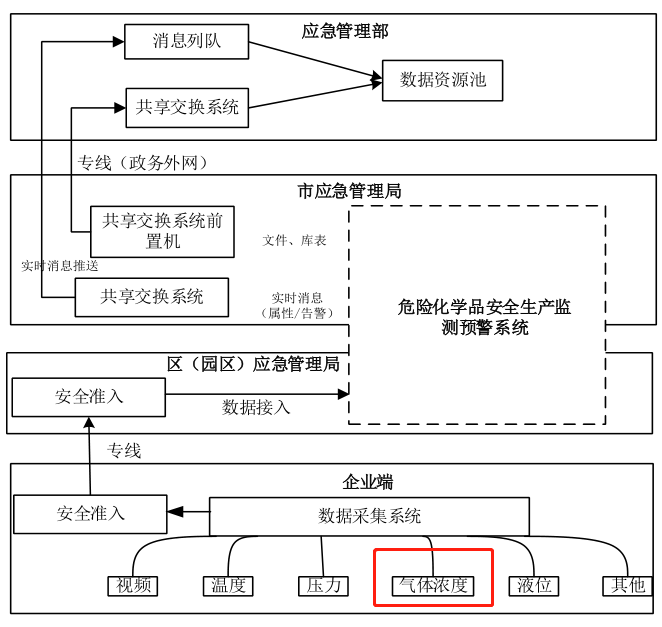 根據應急管理部相關建設指南要求,危險化學品安全生產風險監測預警系統利用數據采集設備,依托專線接入企業重大危險源的實時監測數據和視頻監控數據等,總體架構設計包括應急管理部、市(區)應急管理部門、化工園區(以下簡稱園區)、企業四級,系統建成后分別集成至上海市應急管理綜應用平臺和部級應急管理大數據應用平臺。危險化學品安全生產風險監測預警系統總體架構如圖 1 所示。